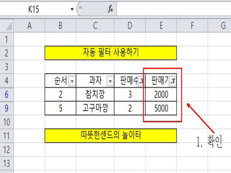 판매가가 2000 이상인 데이터가 표시된 것을 알 수 있습니다. 이처럼 자동 필터를 적용하는 것은 어렵지 않습니다. 의외로 어려워 하는 부분은 적용한 자동 필터를 해제하는 방법입니다. 이 부분도 저와 함께 알아보겠습니다.
