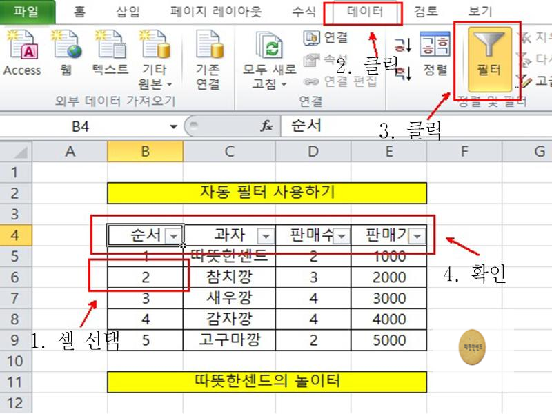 자동 필터를 적용하기 위해서 B4:E9셀 영역에 셀 하나를 클릭합니다. 저는 B6셀을 클릭하였습니다. 매우 중요하므로 잘 기억해야 합니다. 만약 B4:E9셀 영역 외의 다른 곳을 클릭하면 엉뚱한 곳에 자동 필터가 적용되니 주의해야 합니다. 위와 같이 순서대로 지정하면 4. 확인 처럼 자동 필터가 적용되는 것을 알 수 있습니다.