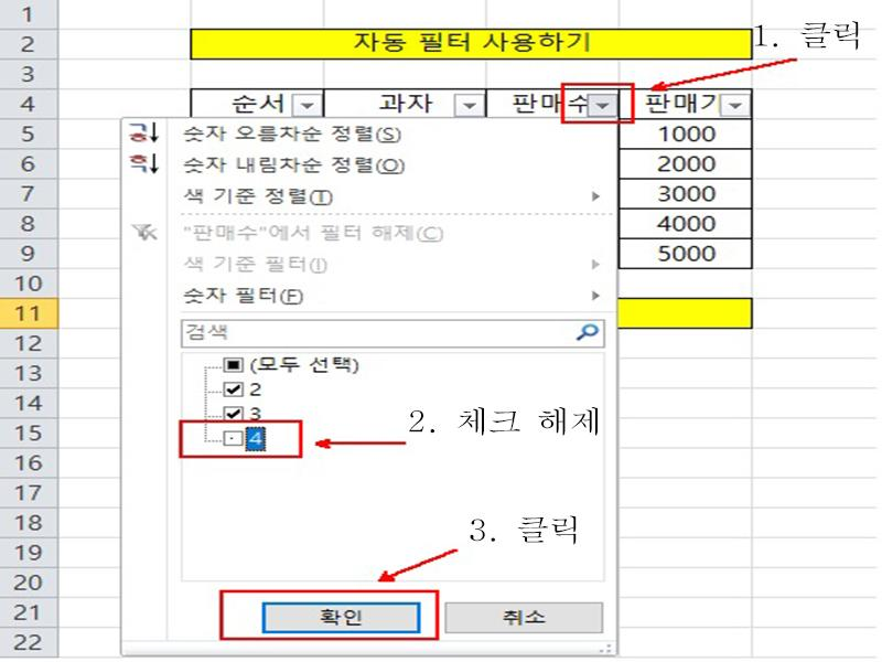 저는 판매수가 4의 값을 가진 셀을 표시하지 않을 것이므로 위와 같이 순서대로 클릭합니다.