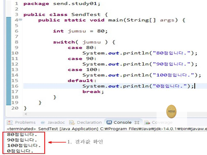 위의 그림은 이클립스로 작성한 소스 코드입니다. 여기서 break문은 17번째 줄 밖에 없습니다. 6번째 줄에서 jumsu 변수에 80이 할당 되었으므로 8번째 줄의 switch( jumsu )는 당연히 9번째 줄의 case 80: 으로 이동하여 "80점입니다."가 출력이 되어야 정상일 것입니다. 하지만 console 창에서 나오는 결과 값은 다르게 나온 것을 알 수 있습니다. 그 이유는 break; 문을 만나면 바로 switch문을 빠져나오지만 break;문이 없기 때문에 11번째 줄의 case 90:, 13번째 줄의 case 100:, 15번째 줄의 default: 문이 연속으로 실행이 됩니다. 그래서 결과 값은 "80점입니다.", "90점입니다.", "100점입니다.", "0점입니다."가 출력이 된 것입니다. 하지만 개발자가 일부로 break;문을 사용하지 않고 위와 같은 결과를 나타내도록 의도하는 경우도 있으니 참고하시면 되겠습니다. 이제 switch문을 사용하는 방법을 이해하셨을 것입니다. 이것으로 JAVA 조건문 switch문을 알아보자를 마치겠습니다. 긴 글 읽어주셔서 감사합니다.