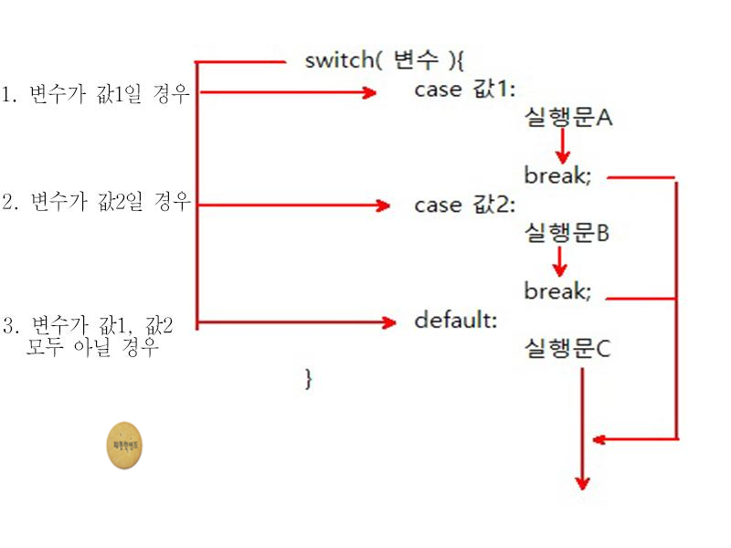 switch문의 사용방법은 위와 같습니다. switch( 변수 )에서 변수가 1일 경우 case 값1: 로 이동하여 실행문A를 실행한 후 break;문을 만나서 switch문을 빠져나가게 됩니다. 변수가 2일 경우 case 값2: 로 이동하여 실행문B를 실행한 후 break;문을 만나서 switch문을 빠져나가게 됩니다. 만약 변수가 값1, 값2 모두 아닐 경우 default: 로 이동하여 실행문 C를 실행한 후 switch문을 빠져나가게 됩니다. 참고로 switch문에서 변수는 char타입(문자)과, String타입(문자열)도 사용이 가능합니다. 이해 되셨을 것입니다. 이제 소스코드로 알아보겠습니다.