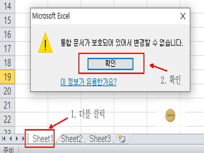 워크시트를 더블 클릭하여 이름을 변경하려고 하면 위와 같이 "통합 문서가 보호되어 있어서 변경할 수 없습니다."창이 뜨면서 이름을 변경할 수 없습니다. 이제 워크시트 이름을 수정할 수 없습니다. 이해 되셨을 것입니다. 이것으로 엑셀 워크시트 이름을 변경하지 못하게 보호하기 엑셀2010을 마치겠습니다. 긴 글 읽어주셔서 감사합니다.