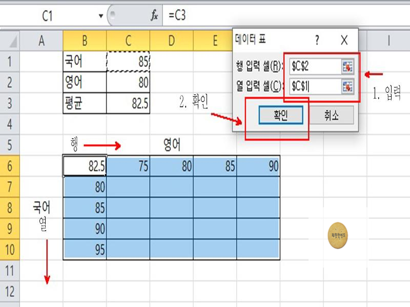 여기서 중요한 개념이 있습니다. B6셀을 선택하고 평균을 구할 것이므로 위와 같이 =C3을 입력해 줍니다. 거의 모든 데이터 표는 위와 같은 형식을 사용합니다. 즉, B6셀은 국어와 영어의 평균 값(82.5)이 지정됩니다. 이제 데이터 표를 구할 준비가 완료된 것입니다.