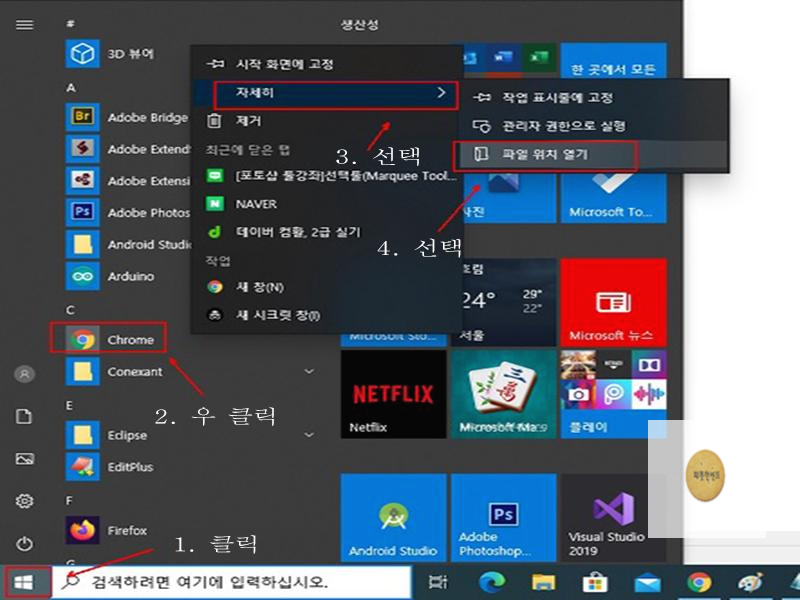 위와 같은 창이 열리면 Chrome 브라우저 아이콘을 선택한 후 마우스 오른쪽 버튼을 클릭한 후 위와 같이 순서대로 진행합니다.