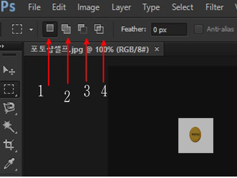 4. 공통 범위 선택 단추 - Intersect with selection 단추 : 기존의 선택 영역과 새로운 선택 영역 가운데 겹치는 부분만 남깁니다.