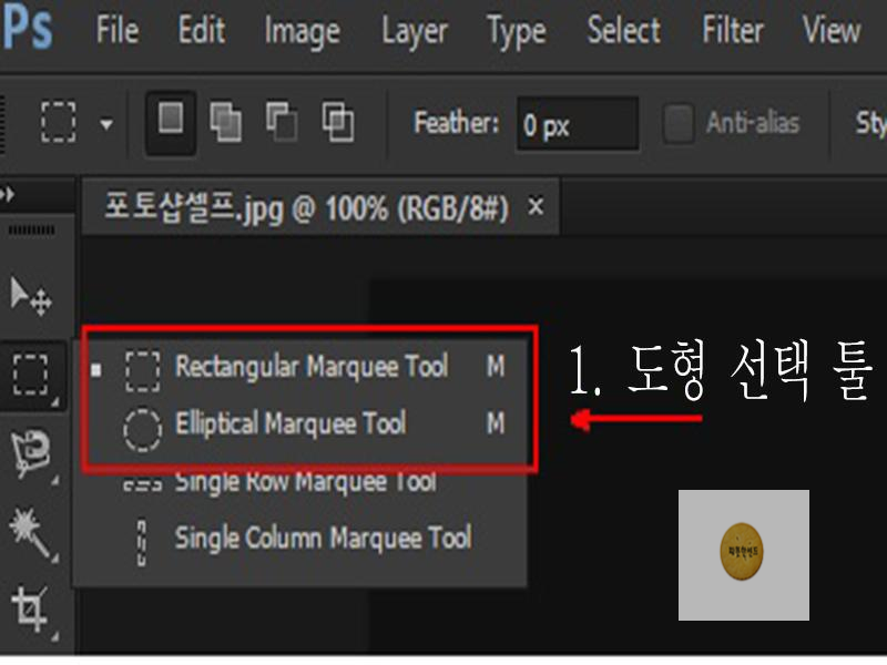 원형 선택 툴(Eliptical Marquee Tool)은 원형으로 선택 영역을 지정할 때 사용합니다.