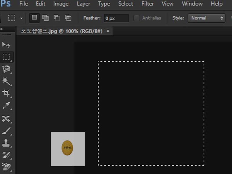 위의 그림은 사각형 선택툴을 지정하고 Shift키를 누르고 드래그하면 정사각형 모양으로 만들어 집니다. 마찬가지로 원형 선택 툴로 Shift키를 누르고 드래그하면 매우 둥근 모양으로 완성이 됩니다.