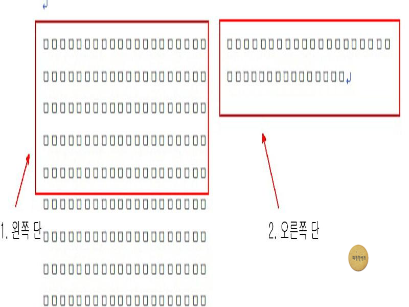 [배분 다단]을 사용하는 방법은 먼저 첫 줄의 왼쪽 단을 채우면 오른쪽 단의 첫줄로 자동으로 넘어갑니다.