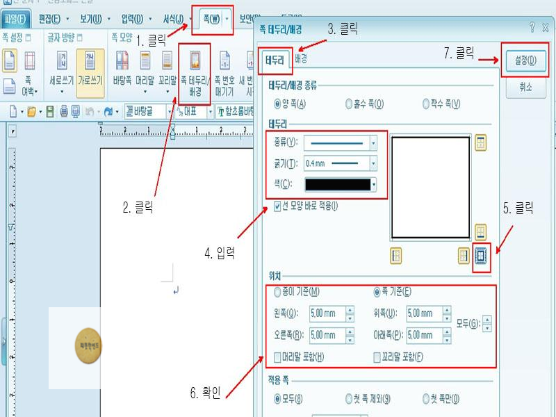 [쪽] --->[쪽 모양] -->[쪽 테두리/배경]을 클릭하여 '쪽 테두리/배경' 창을 호출합니다. 단축 키는 Alt + W, B입니다. '쪽 테두리/배경' 창에서 [테두리] 탭에서 테두리의 종류와 굵기를 지정한 후 테두리를 표시하기 위해 5. 클릭(모두)을 클릭합니다. 이어서 테두리의 위치(6.확인)를 지정해야 합니다. 테두리 위치를 지정하지 않으면 기본 값으로 기준이 왼쪽/오른쪽/위쪽/아래쪽 여백이 5mm로 설정되어 있습니다. 테두리 위치를 지정하거나 기본 값 그대로 사용하고 싶다면 <설정>을 클릭하여 완료합니다.