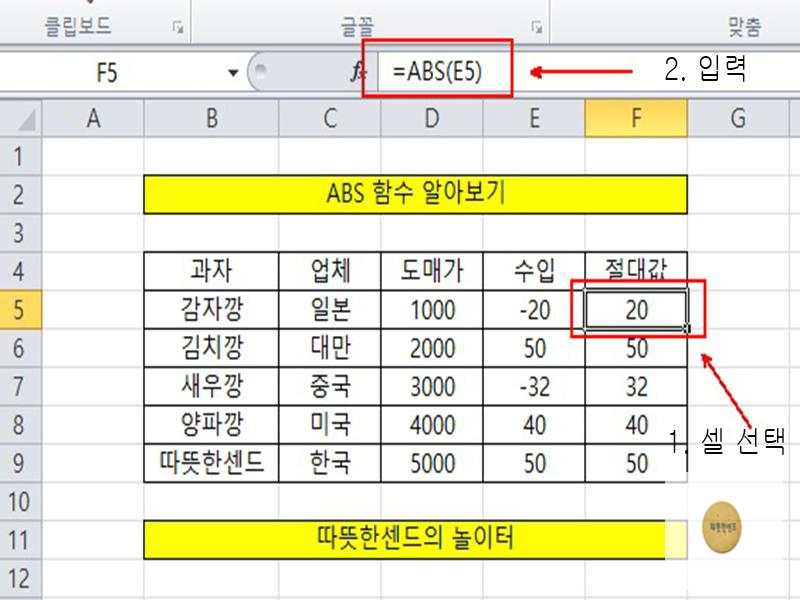 ABS 함수는 숫자의 부호 없이 숫자의 크기만을 나타내는 절대값을 계산할 때 사용합니다.