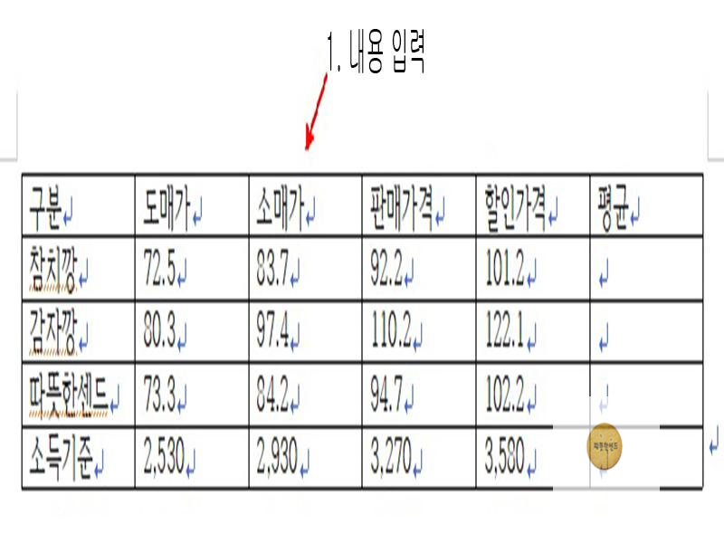 표에 위와 같이 내용을 입력합니다. 표와 관련된 바로 가기 키를 알아보겠습니다.
