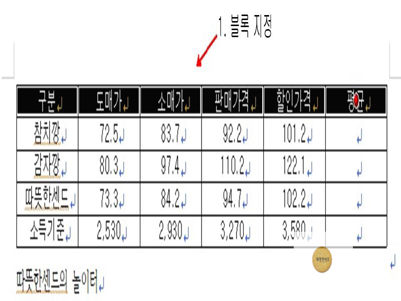 문서에 표가 삽입되었습니다. 여기서 표에서 블록을 지정하는 몇가지 방법과 셀과 셀 사이의 이동을 살펴보겠습니다.