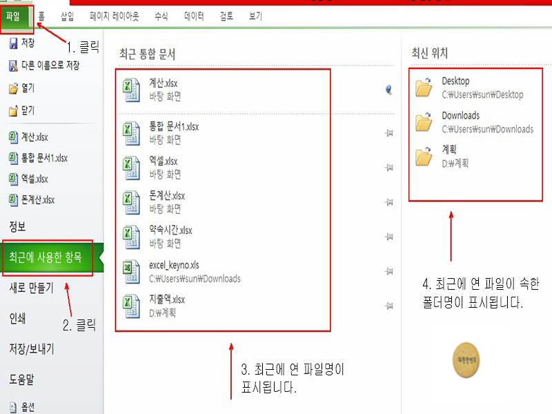 매번 같은 파일을 열어 작업하는 경우가 많습니다. 이때 최근 사용 목록을 이용하면 좀 더 빠르게 파일을 열어 작업할 수 있습니다. 엑셀 2010부터는 파일뿐만 아니라 파일이 들어 있는 폴더도 함께 표시해주므로 효과적으로 원하는 파일을 선택할 수 있습니다. 저와 함께 알아보겠습니다.