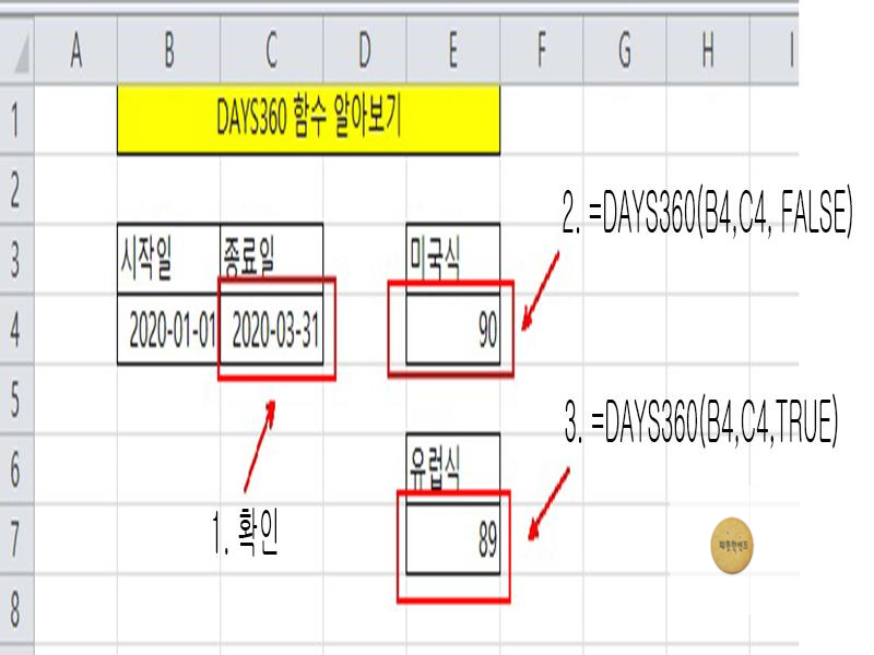 DAYS360 함수는 1년을 360일(12달x30일)로 가정하고 두 날짜 사이의 일수를 반환하는 함수로, 회계 계산에 사용됩니다.