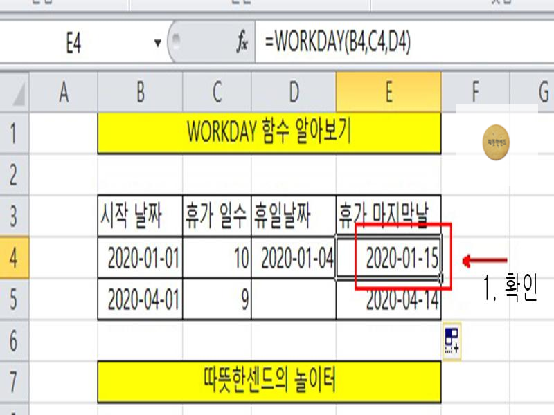 E4셀(2020-01-15) 처럼 날짜 형식으로 바뀌게 된 것을 확인 했습니다. =WORKDAY(B4,C4,D4) 수식을 살펴 보겠습니다. B4셀의 값 2020-01-01 날짜에서 토, 일요일과 휴일 날짜 2020-01-04(D4셀)를 제외하고 10일째(C4셀)가 되는 2020-01-15의 값이 E4셀의 값에 입력됩니다. E5셀 같은 경우는 B5셀의 값 2020-04-01 날짜에서 토, 일요일을 제외한 9일째(C5셀)가 되는 2020-04-14의 값이 E5셀에 입력됩니다. 중요한 개념을 더 알아 보겠습니다. 더해지는 날짜 수는 정수만 가능하므로 소수점 이하 자릿수는 무시됩니다. 이해 되셨을 것입니다. 이것으로 엑셀 주말을 제외한 휴가 마지막 날 계산하기 WORKDAY 함수 엑셀2010을 마치겠습니다. 긴 글 읽어주셔서 감사합니다.