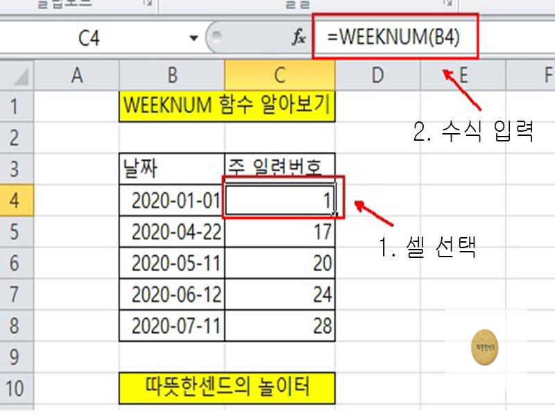 C4셀을 선택하고 수식입력 줄에 =WEEKNUM(B4)을 입력합니다. B4셀의 값 2020-01-01은 일년 중 1번째 주이므로 C4셀에 1이 입력됩니다. 이해 되셨을 것입니다. 사용하는 방법은 이처럼 간단합니다. 이것으로 엑셀 몇 번째 주에 속하는지 일련번호 계산하기 WEEKNUM 함수 알아보기 엑셀2010을 마치겠습니다. 긴 글 읽어주셔서 감사합니다.