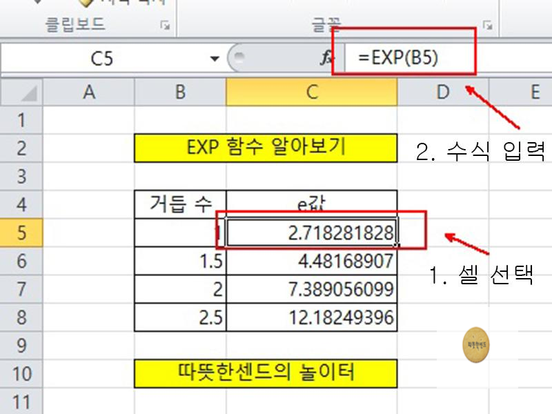 EXP 함수는 e를 숫자만큼 거듭 제곱한 값을 반환합니다.