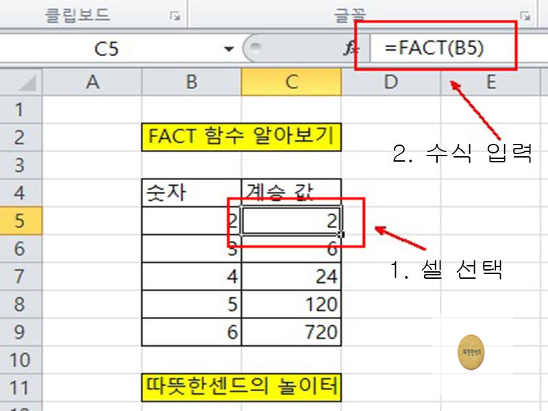 C5셀을 선택하고 수식입력 줄에 =FACT(B5)을 입력합니다. B5셀의 값 2의 계승값인 2 x 1이 계산되어 2가 B5셀에 입력됩니다. 만약 5의 값이라면 5 x 4 x 3 x 2 x 1이 계산되어 120값이 추출될 것입니다. 이해 되셨을 것입니다. 이것으로 엑셀 계승값 계산하기 FACT 함수 엑셀2010을 마치겠습니다. 긴 글 읽어주셔서 감사합니다.