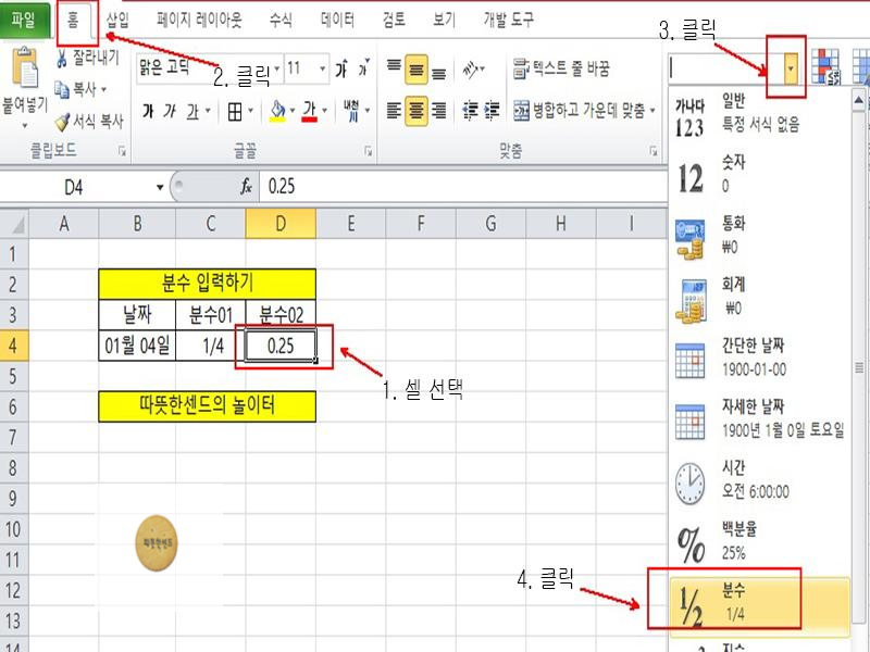 D4셀을 확인해 보면 1/4 분수가 정확히 입력되어 있는 것을 확인할 수 있습니다. 이제 엑셀에서 분수를 입력하는 방법을 알았을 것입니다. 이것으로 엑셀 분수 쉽게 입력하기 엑셀2010을 마치겠습니다. 긴 글 읽어주셔서 감사합니다.