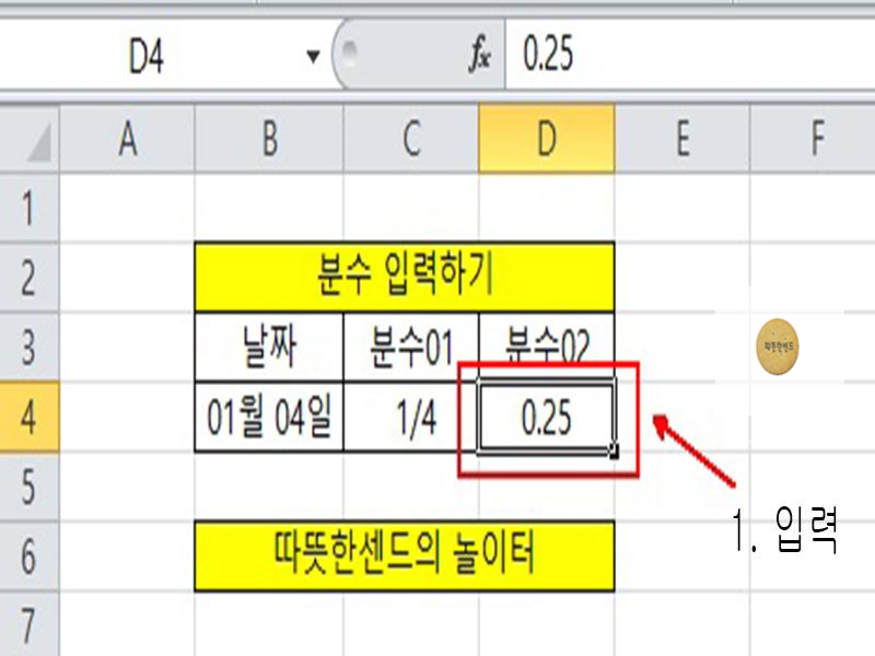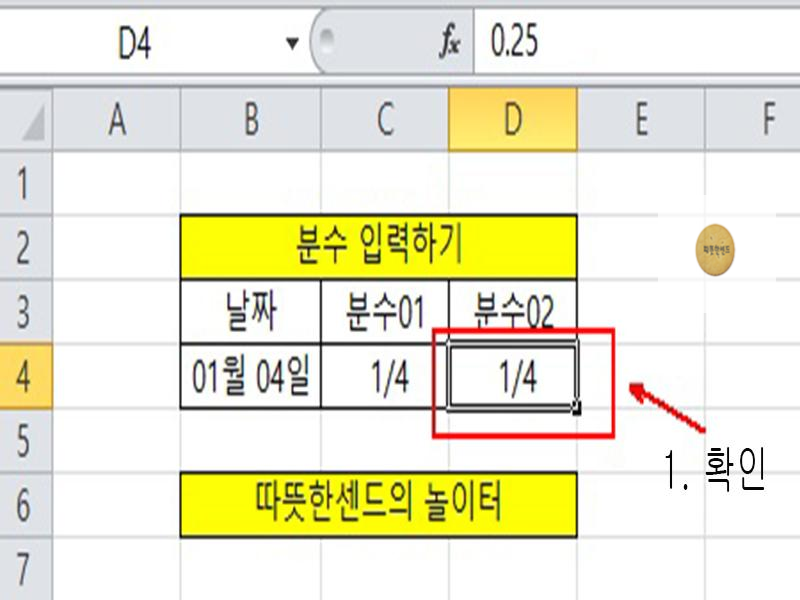 이번에는 소수 값을 분수로 입력해 보겠습니다. D4셀을 선택하고 0.25를 입력합니다.