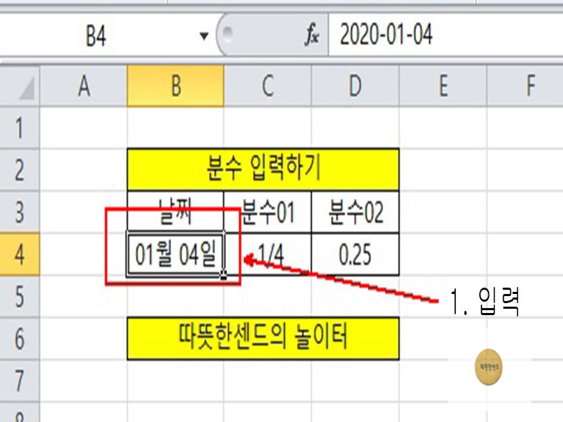B4셀을 선택하고 '1/4'을 입력하면 1월 4일 날짜 값이 입력됩니다. 수식입력줄에 보면 2020-01-04로 표시된 것을 알수있습니다.