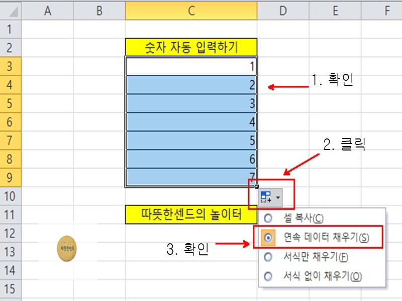 위와 같이 빈셀에 숫자가 자동으로 채워진 것을 알 수 있습니다. 위의 그림에서 2. 클릭이 자동 채우기 옵션인데 클릭하면 '연속 데이터 채우기'가 선택되어 있는 것을 알 수 있습니다. 이것은 자동 채우기의 기본값입니다.