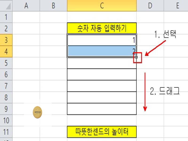 C3:C4셀을 블록으로 지정하고 C4셀의 오른쪽 하단의 모서리 부분을 클릭하고 C9셀까지 드래그합니다.