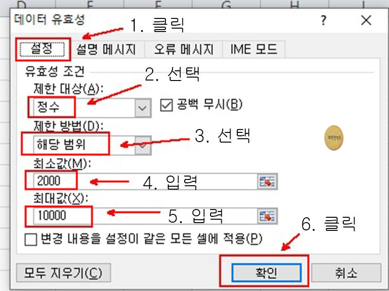 '데이터 유효성'창이 나타나면 [설정] 탭을 선택하고 위와 같이 순서대로 입력합니다. 다 입력하였으면 <확인>을 클릭합니다.