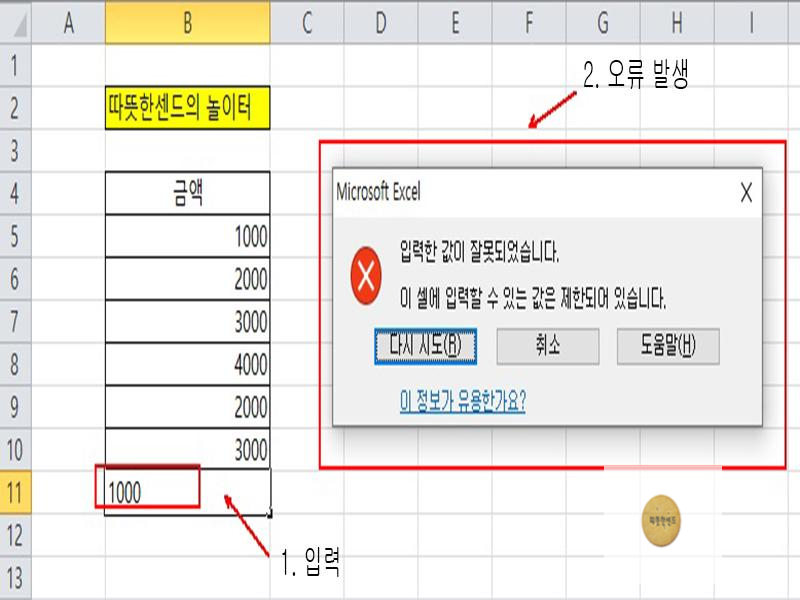 저는 최소값을 2000, 최대값을 10000으로 설정하였습니다. 즉, 이 범위의 숫자만 허용이 됩니다. 위의 그림은 B11셀에 1000은 최소값 2000과 최대값 10000 사이의 값이 아니므로 오류 창이 뜨게 됩니다. 오류 창에서 <취소>를 클릭하면 입력된 값을 취소하고 다시 입력할 수 있습니다. 이해 되셨을 것입니다. 훌륭한 기능이니 꼭 습득하시길 바라겠습니다. 이것으로 엑셀 특정 범위의 숫자만 입력하기 엑셀2010을 마치겠습니다. 긴 글 읽어주셔서 감사합니다.