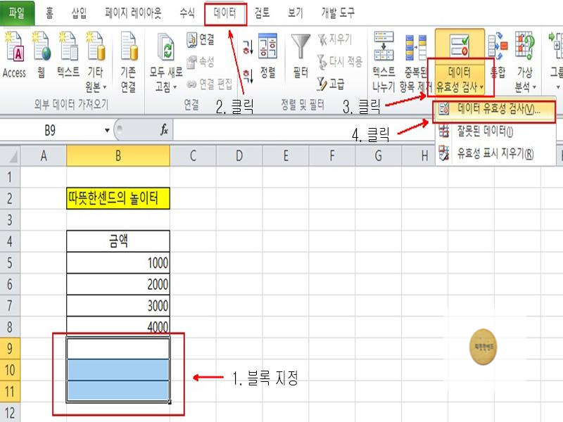 B9:B11셀을 블록으로 지정하고 [데이터] 탭 - [데이터 도구] 그룹 - [데이터 유효성 검사]를 클릭합니다.