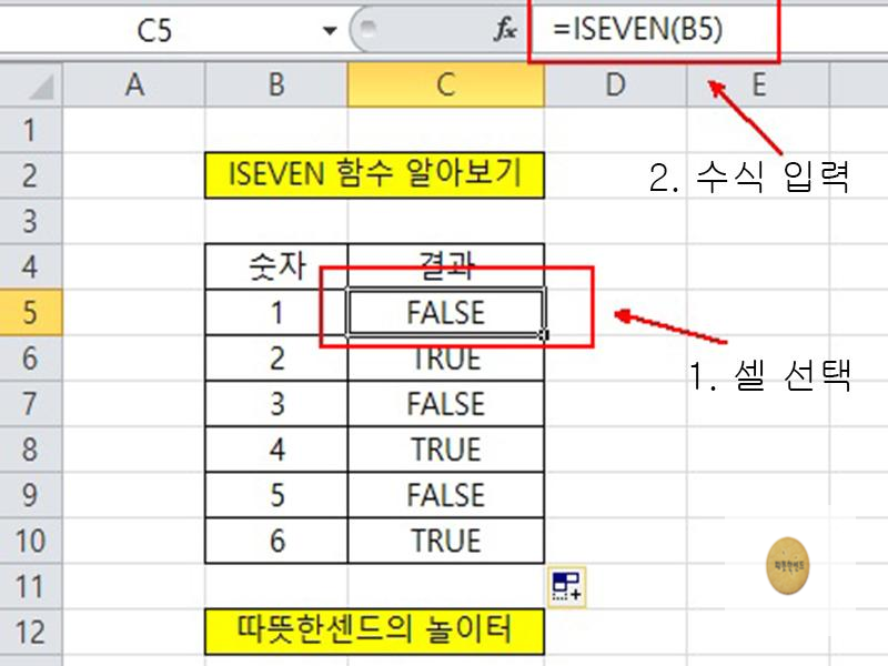 ISEVEN 함수는 짝수가 입력되어 있는 셀에 대해 TRUE를 반환하는 함수입니다.