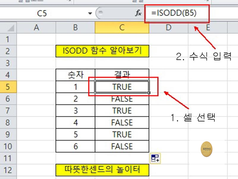 ISODD 함수는 홀수가 입력되어 있는 셀에 대해 TRUE를 반환하는 함수입니다.