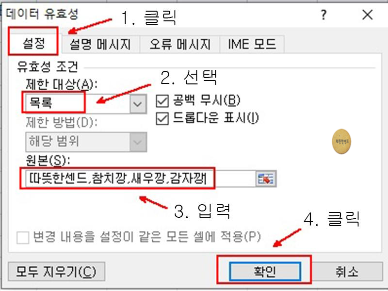 '데이터 유효성'창이 뜨면 [설정]탭에서 '제한 대상'을 '목록'으로 선택합니다. 이어서 '원본'입력란에 따뜻한센드,참치깡,새우깡,감자깡을 입력하고 <확인>을 클릭하여 완료합니다.