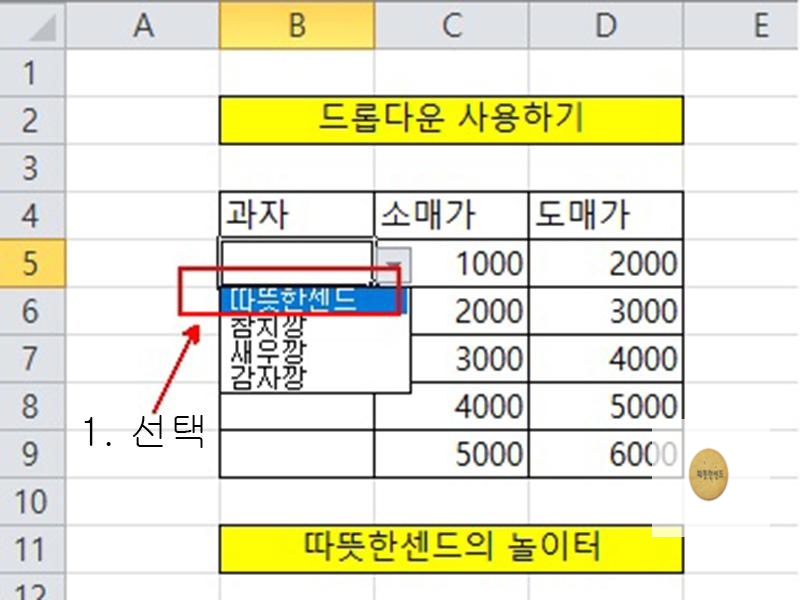 '데이터 유효성'창에서 입력했던 따뜻한센드, 참치깡, 새우깡, 감자깡 목록이 보일것입니다. 이처럼 원하는 값을 입력하므로써 그 외의 값이 입력되는 것을 완전히 막을 수 있습니다. 그러므로 실수를 할 일이 없다는 것입니다. 이런 훌륭한 기능을 잘 습득하고 실무에 잘 적용하면 좋을 것입니다. 저는 따뜻한센드를 선택하였습니다.