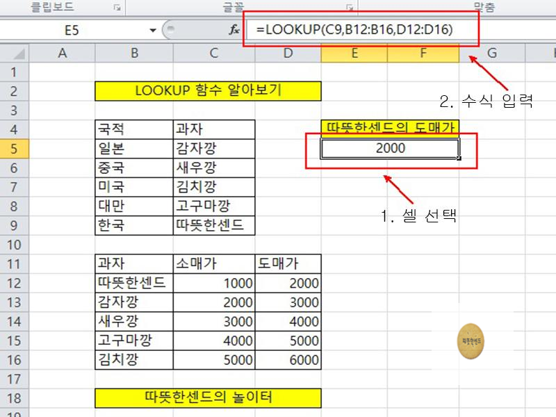 따뜻한센드의 도매가를 구하기 위해 E5셀을 선택하고 수식입력 줄에 =LOOKUP(C9,B12:B16,D12:D16)을 입력합니다. LOOKUP 함수는 인수가 3개가 사용되는데 하나씩 알아보겠습니다. 첫번째 인수 C9(따뜻한센드)는 찾을 값을 나타냅니다. 두번째 인수 B12:B16은 찾을 범위를 말합니다. 즉, C9셀의 값 따뜻한센드가 B12:B16셀의 범위에서 몇번째 행에 있는지 찾습니다. 세번째 인수 D12:D16은 B12:B16셀에서 C9셀의 값 따뜻한센드가 있는 행의 위치(1행)에 해당하는 값을 찾는 범위입니다. 즉, =LOOKUP(C9,B12:B16,D12:D16)은 B12:B16범위에서 C9셀의 값에 있는 따뜻한센드가 있는 행위 위치 1을 구한 후 D12:D16셀에서 1행에 해당하는 값 2000(D12셀)이 구해집니다. 어렵다면 여러번 반복 실습해보시기 바랍니다. 이것으로 엑셀 따뜻한센드의 도매가 구하기 LOOKUP 함수 엑셀2010을 마치겠습니다. 긴 글 읽어주셔서 감사합니다.