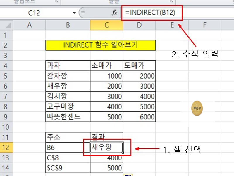 C12셀을 선택하고 수식 입력줄에 =INDIRECT(B12)을 입력합니다. B12셀에 텍스트로 입력된 "B6"가 셀 주소로 변환 되므로 B6셀의 값 "새우깡"이 C12셀에 입력된 것을 알 수 있습니다. B13셀 같은 경우에는 B13셀에 텍스트로 입력된 "C$8"가 셀 주소로 변환 되므로 C$8셀의 값 4000이 C13셀에 입력된 것을 알 수 있습니다. 이해 되셨을 것입니다. 이것으로 엑셀 문자열을 셀 주소로 변환하기 INDIRECT 함수 엑셀2010을 마치겠습니다. 긴 글 읽어주셔서 감사합니다.