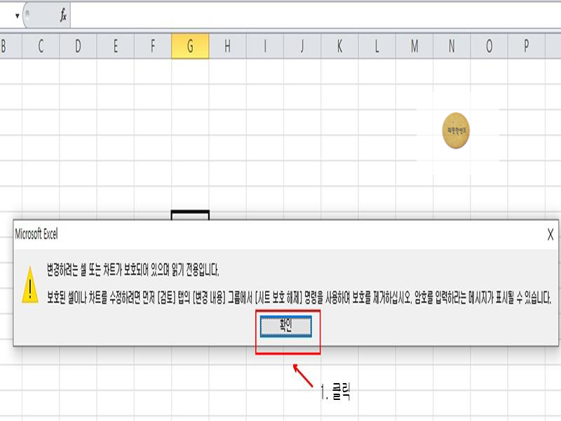 워크시트의 값을 수정하거나 입력할 때 다음과 같은 메시지 창이 나타납니다. 내용을 잘 읽어보고 <확인>을 클릭하여 창을 닫습니다.