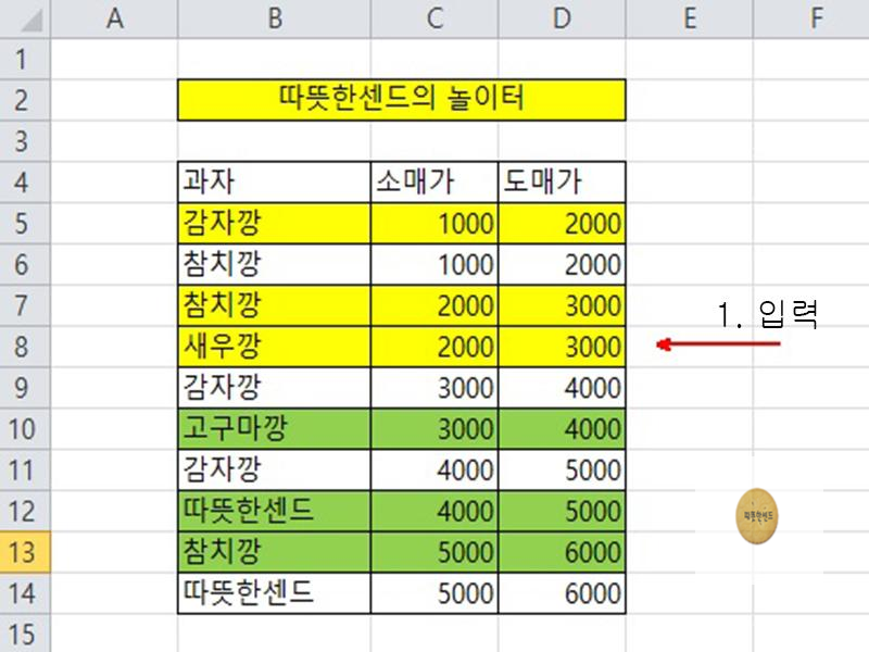 위와 같이 표 서식을 지정하고 값을 입력합니다. 색상은 노랑과, 연한 녹색으로 지정합니다.