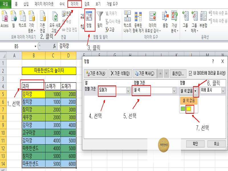 B4:D14범위에서 임의의 셀을 선택한 후 [데이터] 탭 - [정렬]을 클릭합니다. '정렬'창이 뜨면 [열] 조건으로 [도매가]를 선택하고 [정렬 기준]에서 ▼목록 화살표를 클릭한 다음 [셀 색]을 선택합니다. 그러면 [정렬] 조건이 하나 늘어나는데, [셀 색 없음]의 ▼목록 화살표를 클릭하고 색상 중에서 먼저 표시될 색을 하나 선택합니다. 저는 노랑을 선택하였습니다.