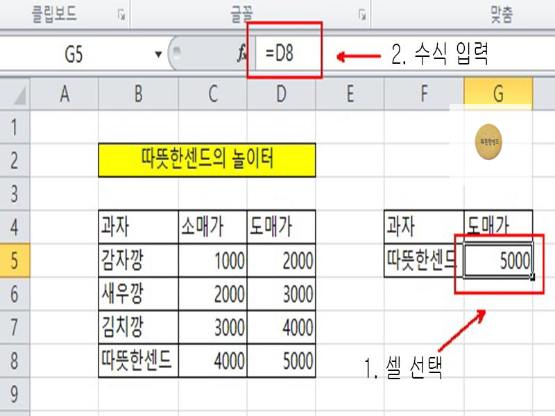 가장 흔히 사용하는 참조 방식입니다. G5셀을 선택하고 등호(=)를 입력합니다. D8셀을 마우스로 클릭하고 Enter를 눌러 수식을 입력합니다. 그러면 G5셀의 수식 입력 줄에 '=D8'라는 수식이 표시되고 G5셀에는 D8셀의 값 5000이 표시되는 것을 알 수 있습니다.