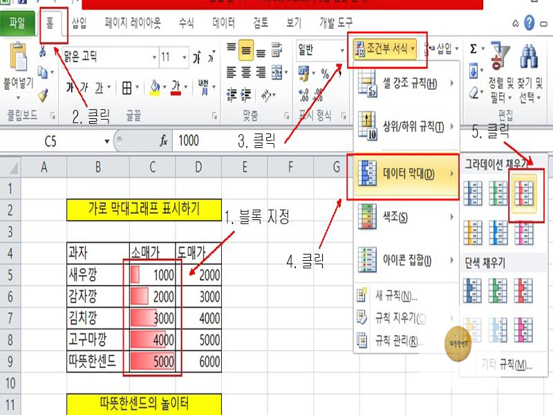 셀의 값중에서 가격이나 판매수량, 비율등은 숫자로 표시됩니다. 이것을 막대그래프를 사용한다면 가독성이 뛰어나고 바로 어떤 셀이 많고 적은지를 한눈에 파악할 수 있습니다. 디자인을 좋아하시는 분들에게는 환영받을 수 있는 기능일 것입니다. 저와 함께 막대그래프 기능을 이용하여 값을 꾸며 보겠습니다.