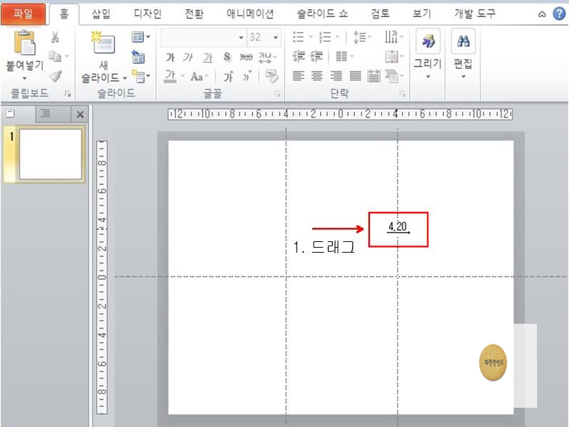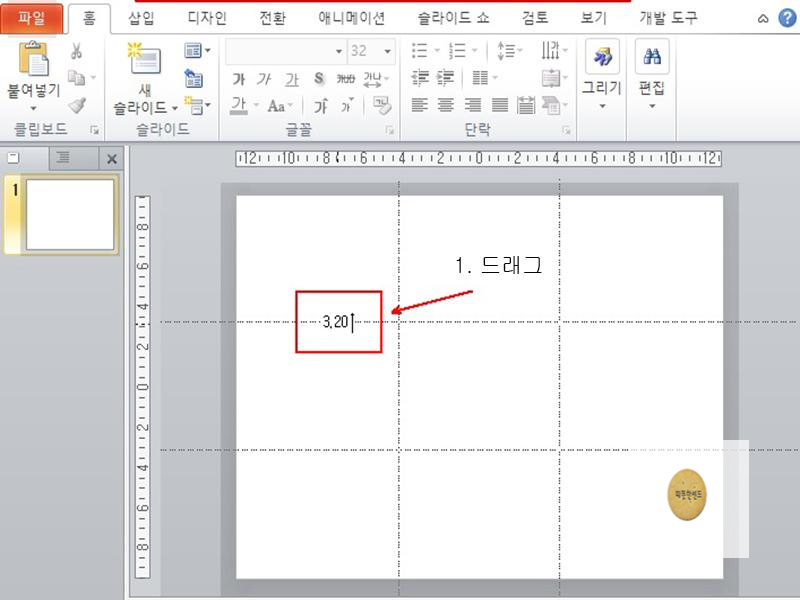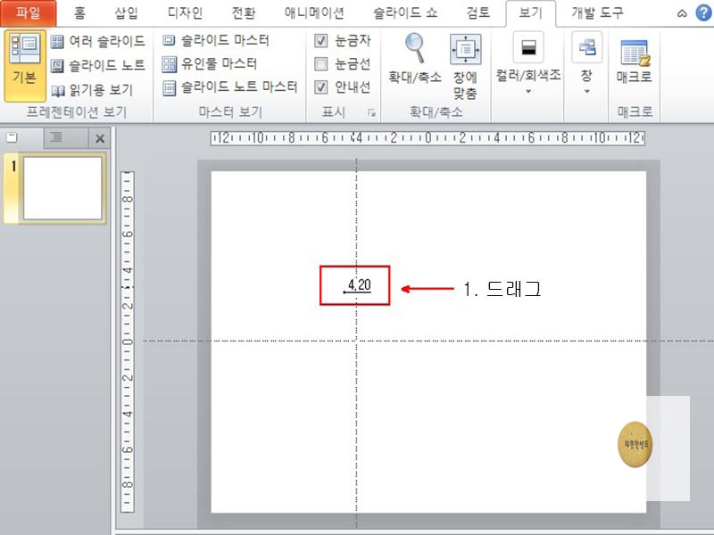 다음으로 가로 안내선을 슬라이드의 아래쪽 3.20 위치로 드래그하여 이동합니다.