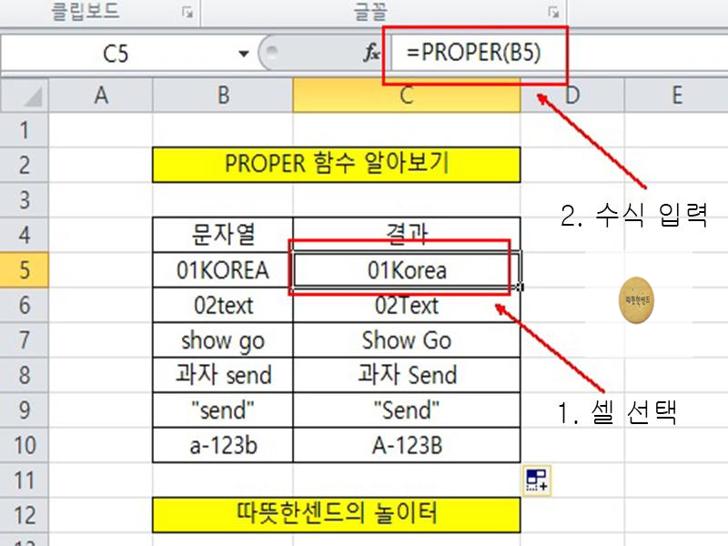 C5셀을 선택하고 수식입력 줄에 =PROPER(B5)을 입력합니다. 즉, =PROPER(B5)는 B5의 값 01KOREA에서 숫자 01은 무시하고 01뒤의 영어문자열 KOREA에서 첫글자만 대문자로 만들고 뒤의 문자는 모두 소문자로 변경합니다. 그래서 C5셀에 01Korea가 입력됩니다. =PROPER(B8)수식 같은 경우에는 과자 send에서 과자와 공백을 무시한 후 문자열 send에서 첫 글자만 대문자로 변경하여 C8셀의 값에 과자 Send가 나타납니다. 이해 되셨을 것입니다. 이것으로 엑셀 대 소문자 알맞게 변환하기 PROPER 함수 엑셀2010을 마치겠습니다. 긴 글 읽어주셔서 감사합니다.