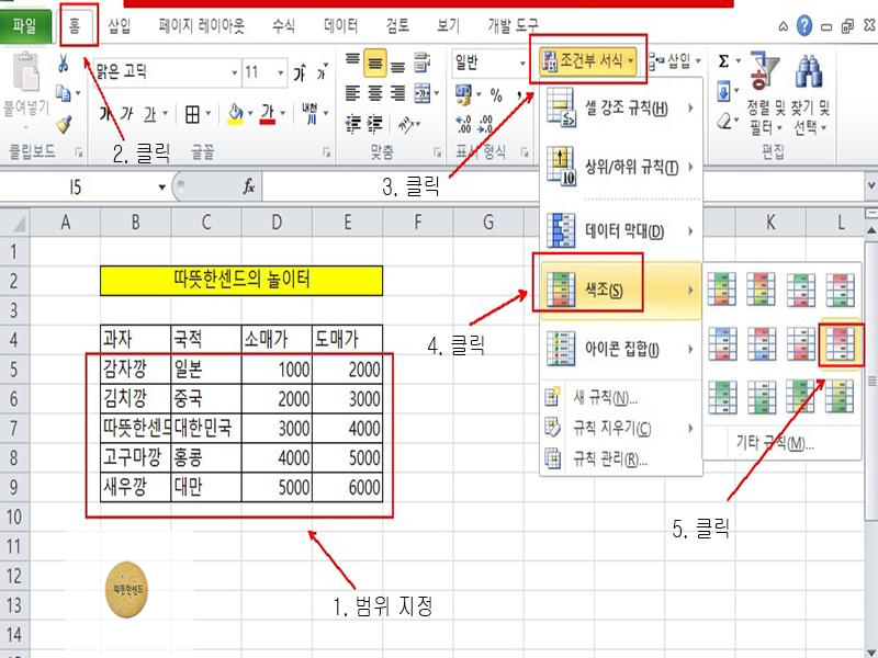 색조를 이용해 숫자를 표시하기 위해서 B5:E9셀을 범위로 지정한 후, [홈] 탭 - [스타일] 그룹 - [조건부 서식]을 클릭합니다. [색조] - [빨강-흰색 색조]를(5. 클릭)선택합니다.