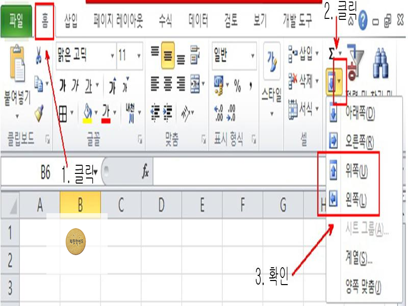 대신 [홈]탭 - '편집' 그룹에 있는 [채우기] 버튼을 이용하면 위쪽이나 왼쪽으로 채우기가 가능합니다. 이것으로 엑셀 채우기 관련 단축키 알아보기 엑셀2010을 마치겠습니다. 긴 글 읽어주셔서 감사합니다.