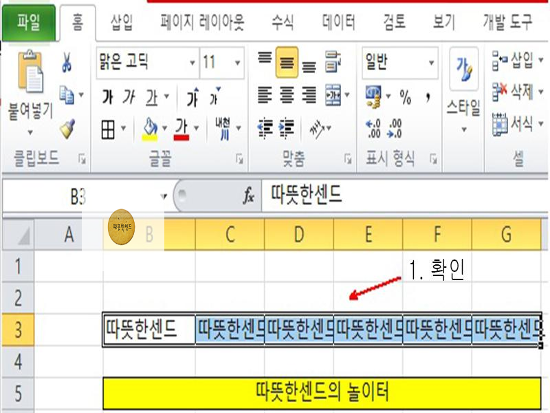 B3:G3을 블록으로 지정하고 Ctrl + R키를 누르면 맨 왼쪽 셀의 내용이 오른쪽으로 채워집니다. 참고로 R은 'Right'의 약자입니다.