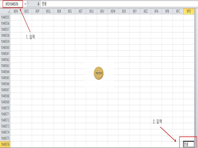 이름 상자에 'XFD1048576'이라고 입력하고 Enter키를 누릅니다. 셀 포인터가 워크시트의 마지막셀로 이동합니다. 마지막셀에 '안녕'을 입력하고 Ctrl + Home키를 눌러 맨 처음 셀로 이동합니다.