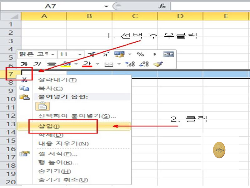 7행을 선택하고 마우스 오른쪽 버튼을 클릭하여 나타나는 바로가기 메뉴에서 [삽입]을 클릭합니다.