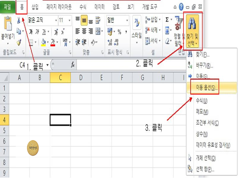 [홈]탭 - [찾기및 선택] - [이동 옵션]을 클릭합니다.