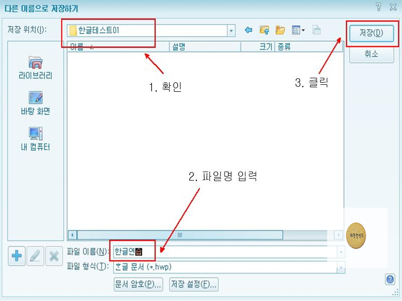 저장할 위치인 [한글테스트01]폴더를 다시한번 확인하고 '파일 이름'에 '한글연습'을 입력하고 [저장]을 클릭합니다. 문서 저장에서 제일 중요한 것은 어느 곳에 저장하는지와 저장한 파일의 이름입니다. 간혼 저장을 해놓고도 어디에 무슨 이름으로 저장했는지를 모르는 경우가 많습니다.